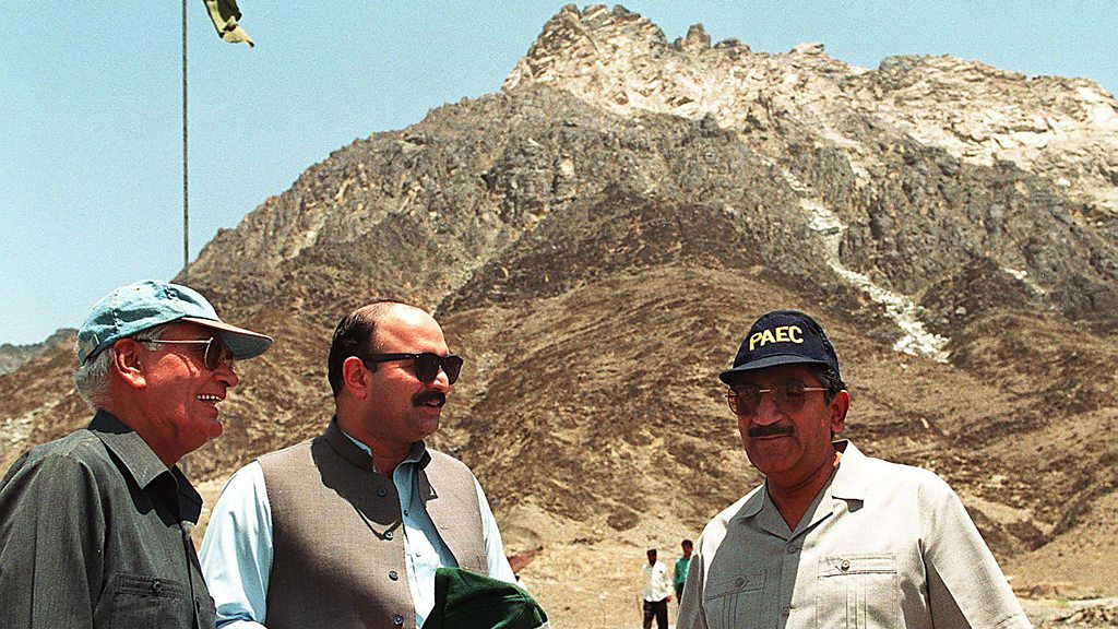In May 1998 Pakistan courted international criticism after it responded to an Indian nuclear test, with an explosion of its own. In 2011 Rob Walker spoke to Dr Samar Mubarakmand who organised the test on the Pakistani side. Photo: Pakistan nuclear scientist Dr. Samar Mubarakmand (right) alongside Dr. Ishfaq Ahmed and Minister of Information Mushahid Hussain, in front of the hill under which Pakistan conducted its nuclear tests in May 1998 (SAEED KHAN/AFP/Getty Images)
