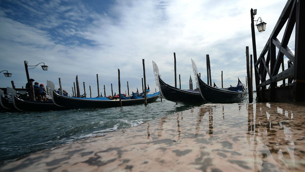 Filmmaker Enrico Michieletto guides presenter Nikki Bedi through Venice's waterways revealing a floating library and costumier to the stars. (Photo: Gondolas in Venice Credit: Getty Images)
