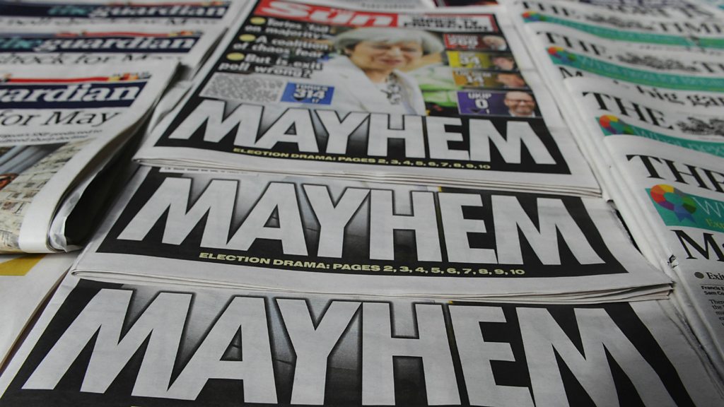 Former Sun editor David Yelland has told Mark Mardell that Jeremy Corbyn "is untouchable by those papers" because "he has gone through the worst possible kicking...that any Labour leader has ever gone through". Mr Yelland, who was the editor from 1998 to 2003, also said "it is very clear that Theresa May can't survive" with both the Daily Mail and The Sun going for her. When talking about the influence of social media he said: "It's now social media that sets the weather and that, if you were a Tory strategist, would be something that you would really worry about." (Photo: Newspapers after the election result. Credit: AFP/Getty Images)