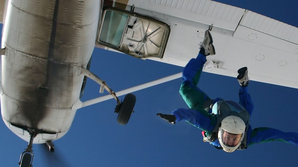 Psychologist Claudia Hammond explains how near-death experiences change our perception of time. (Image: Skydiver exiting a small airplane. Credit: Getty Images)