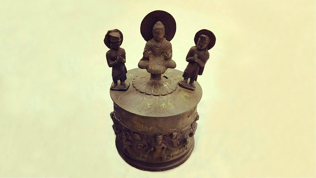 The mystery of the 2,000 year old little bronze box, the Kanishka casket, that was said to hold the remains of the Buddha himself. Presented by Kanishk Tharoor Produced by Maryam Maruf Contributor: Vazira Fazila-Yacoubali Zamindar, Brown University Picture: Replica of the Kanishka casket at the British Museum Credit: BBC