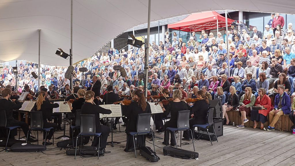 Clemency Burton-Hill introduces a short movement from Handel’s Water Music, the Gigue from Suite No.3, performed by the Royal Northern Sinfonia under the baton of Nicholas McGegan at the Stage @ TheDock in the English port city of Hull. Photo: The prom at the Stage@TheDock in Hull. (Credit: Les Gibbon/BBC)