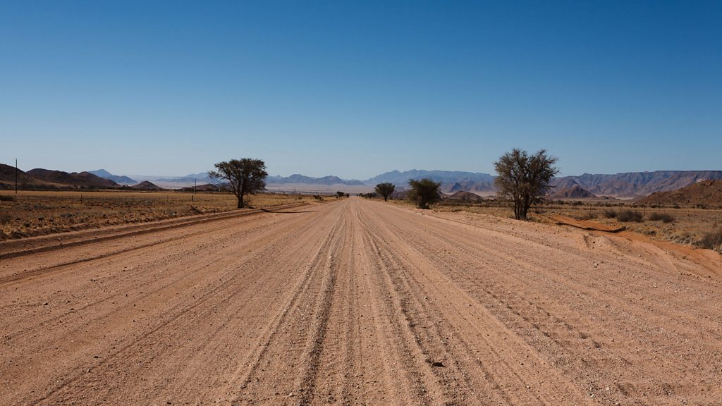 Alice Williamson, lecturer at the University of Sydney, explains to presenter Marnie Chesterton why roads made of loose sand or gravel develop regular bumps. (Image: Dirt road in Namibia Credit: Getty Images)