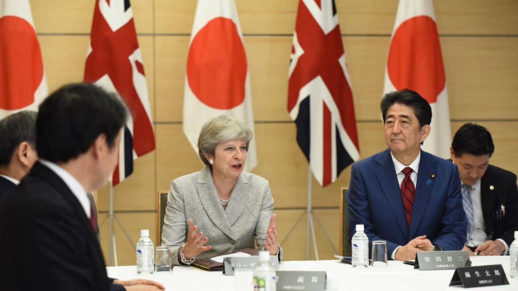 Prime Minister Theresa May has been in Japan to try to ease the Japanese corporate world's worries about Brexit. There are plenty of reasons to be worried, as Japanese companies are heavily invested in Britain - there are more than 1,000 in the UK, employing about 160,000 people here. Japan's Prime Minister Shinzo Abe said that Brexit, "has to be successful for the UK, European Union, and global economy." Just what did he mean by that? Dan Damon spoke to to Dr Seijiro Takeshita, Professor at the School of Management at Japan's University of Shizuoka. We also have analysis from our Political Correspondent Chris Mason, and we hear from Theresa May's former communications chief, Katie Perrior. (IMAGE: British Prime Minister Theresa May (C) talks while Japanese Prime Minister Shinzo Abe (R) listens during their meeting of Japan's National Security Council at Abe's official residence in Tokyo on August 31, 2017 - KAZUHIRO NOGI/AFP/Getty Images)