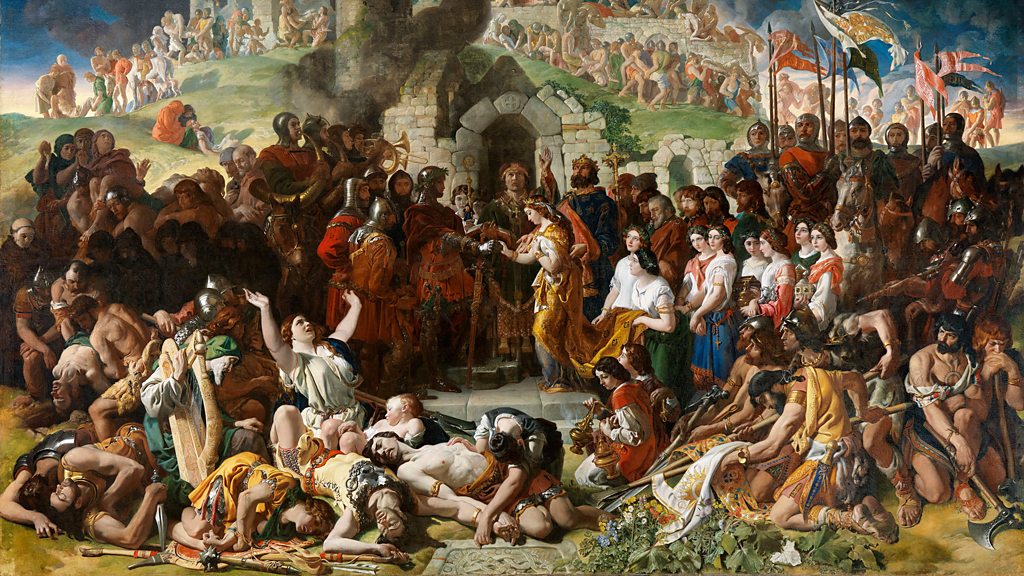 Tuairisc Aonghus Uí Lochlainn ó Ghailearaí Náisiúnta na hÉireann áit ar phlé Diarmuid de Faoite an pictiúr drámatúil, 'Pósadh Strongbow agus Aoife'. Insíonn an pictiúr ola álainn seo scéal phósadh Richard de Clare, nó Strongbow mar is fearr aithne air, agus iníon Dhiarmait Mhic Murchada, Rí Laighin, Aoife i 1170 i bPort Láirge. Aonghus Ó Lochlainn reports from the National Gallery where Diarmuid de Faoite discussed the dramatic painting 'The marriage of Strongbow and Aoife' by Daniel Maclise. Daniel Maclise’s (1806-1870), The Marriage of Strongbow and Aoife following conservation funded by the Bank of America Merrill Lynch Art Conservation Project. Photo © Maxwell Photography
