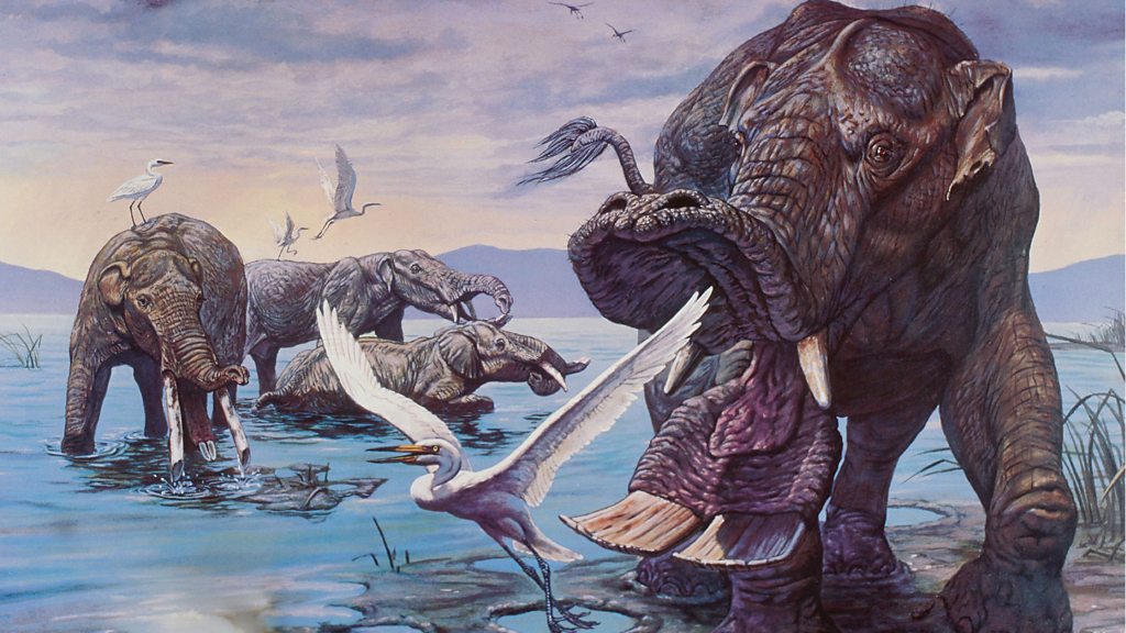 Fossil expert Richard Twitchett shows us some animals that were around in the Pliocene, three million years ago – the last time carbon dioxide levels were as high as they are today. (Image: Early Mastodonts Illustration, Credit: Science Photo Library)