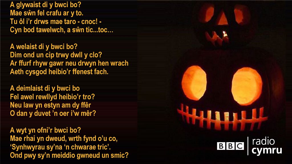 A glywaist di y bwci bo? Mae sŵn fel crafu ar y to. Tu ôl i’r drws mae taro - cnoc! - Cyn bod tawelwch, a sŵn tic...toc… A welaist di y bwci bo? Dim ond un cip trwy dwll y clo? Ar ffurf rhyw gawr neu drwyn hen wrach Aeth cysgod heibio’r ffenest fach. A deimlaist di y bwci bo Fel awel rewllyd heibio’r tro? Neu law yn estyn am dy ffêr O dan y duvet ’n oer i’w mêr? A wyt yn ofni’r bwci bo? Mae rhai yn dweud, wrth fynd o’u co, ‘Synhwyrau sy’na ‘n chwarae tric’. Ond pwy sy’n meiddio gwneud un smic? Osian Rhys Jones