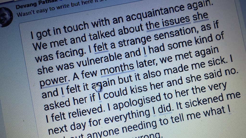 "I felt a strange sensation, as if she was vulnerable and I had some kind of power." That's part of a tweet from a writer in India in relation to the #MeToo movement. He responded with an admission of his own impropriety towards a woman. Women and men from all over the globe who have been sexually harassed have been sharing their stories across social media using the hashtag. It followed further allegations of rape against Hollywood producer Harvey Weinstein. Using the #IDidThat Devang Pathak in Mumbai posted: "It wasn't easy to write but here it is. I am sorry and I will do better." Devang spoke to BBC Desi Download...