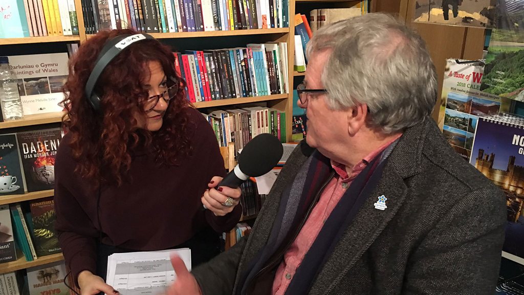 Dafydd Iwan sy'n sgwrsio gyda Shân Cothi o siop Awen Meirion Y Bala.