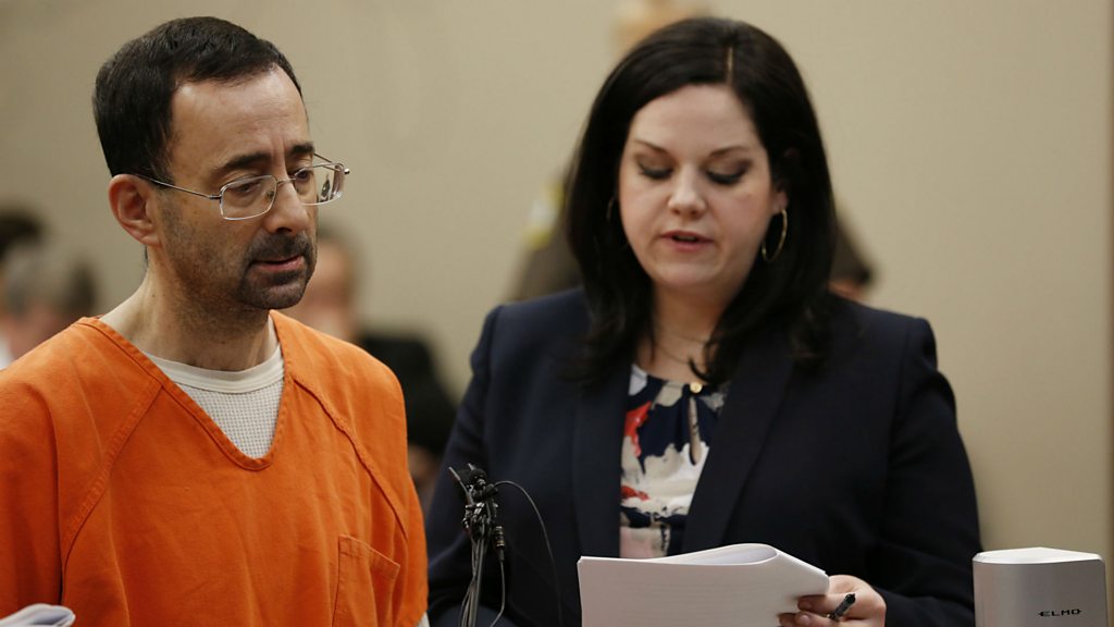 Shannon Smith was defence lawyer for Larry Nassar, the former USA Gymnastics doctor sentenced on 24th January to up to 175 years in prison for molesting girls under his care. What was it like to represent a man accused of some of the worst sex crimes imaginable? (Photo: Former Michigan State University and USA Gymnastics doctor Larry Nassar (L) listens to defense attorney Shannon Smith (R) in Ingham County Circuit Court in Lansing, Michigan, 22 November 2017. Credit: JEFF KOWALSKY/AFP/Getty Images)