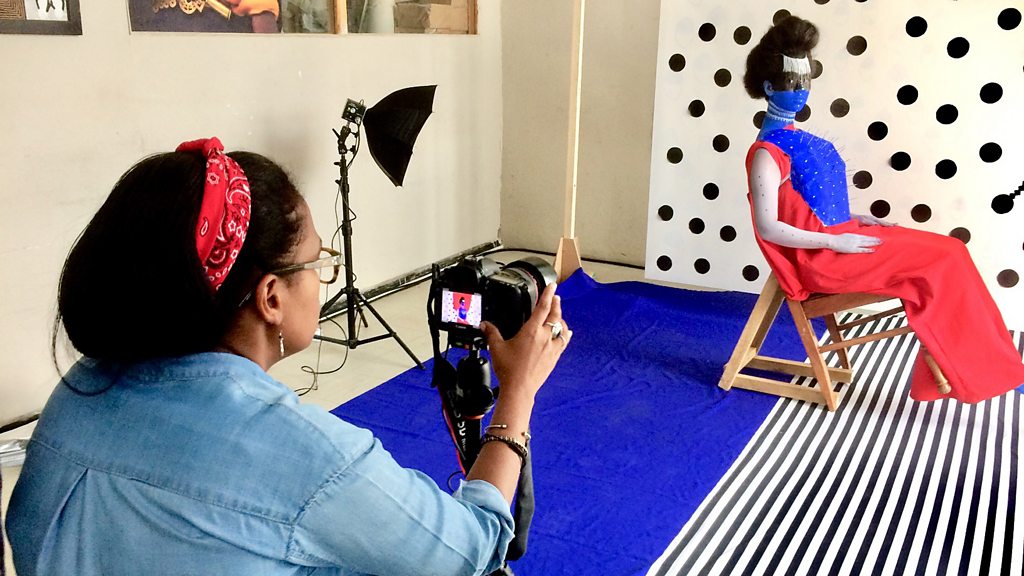 'Picasso came to Africa and took a lot as an inspiration'. Ethiopian photographic artist Aida Muluneh is known for the distinct use of primary colours and traditional body painting in her photo shoots. She told the BBC's Nikki Bedi how her culture inspires her work. Picture: Aida Muluneh in her studio. Credit: BBC