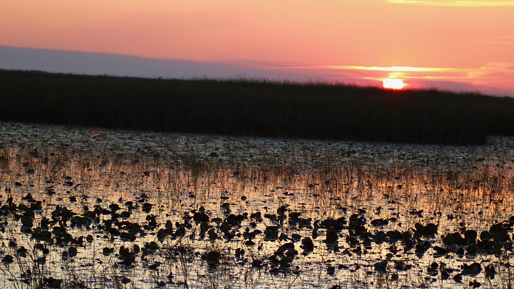 A glorious sunset over the Florida Everglades conjures a cacophony of native wildlife including a lilting chorus of frogs and crickets, chirping boat-tailed grackles, fish slapping in the water and a noisy roost of snowy egrets, the faint call of the mysterious anhinga.