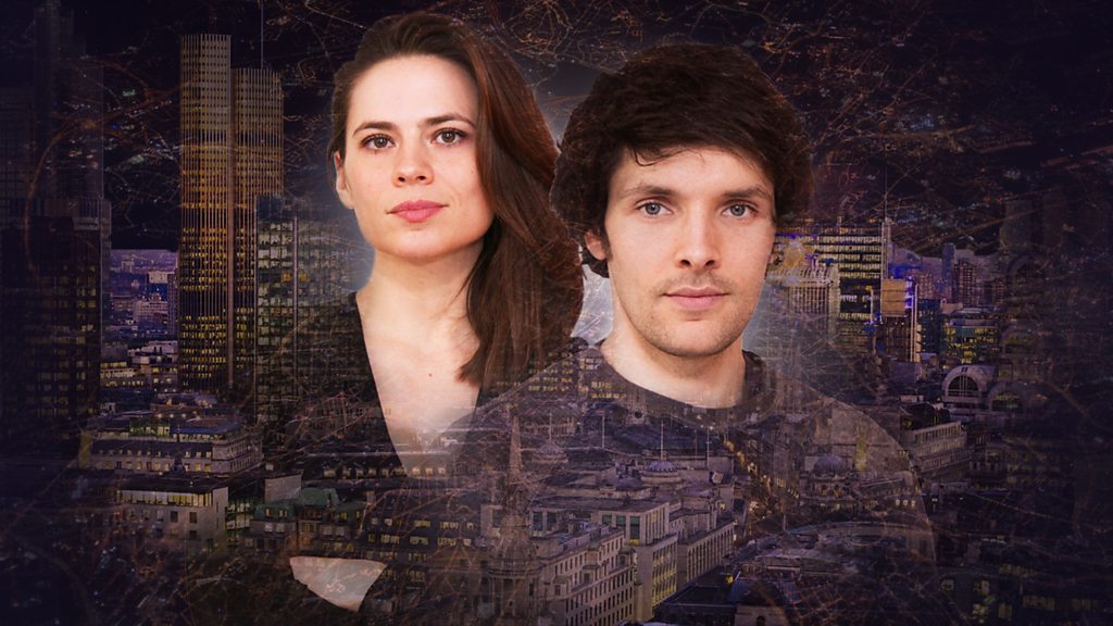 Colin Morgan and Hayley Atwell star as lovers Portia and Bassanio in The Merchant of Venice, set in the 2008 financial crisis.