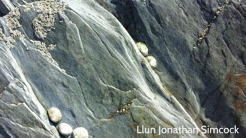 Annwyl Galwad Cynnar Dw i'n digon lwcus i fod ar wylia yng Nghymru yr wythnos yma. Wrth gerdded ar Draeth Mawr (Whitesands) ger Ty Dewi welais nifer o gregyn, sef Llygad Maharen (Limpet) ar waelod y clogwyn yno. Yn y llun gewch gweld rhai, ac wrth eu hochr, cylchoedd o'r un maint, wedi nafu yn y graig. Ydy'r cylchoedd yma wedi'i wneud gan y llygad haharan, os felly, sut? Yn gywir Jonathan Simcock
