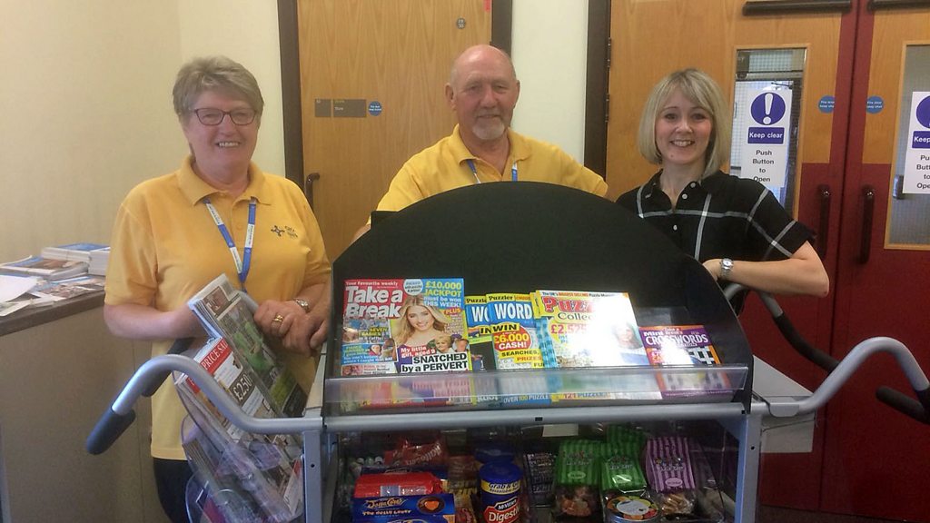 Rebecca Hayes yn sgyrsio gyda 'criw trolley' Ysbyty Glangwili.