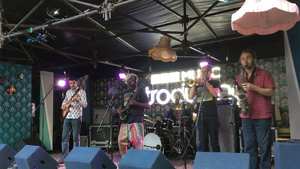 Congolese jazz ensemble Kongo Dia Ntotila perform Mutwashi from their new album 360° on the BBC Introducing stage at Latitude. The self-described 'Afro-JOY' outfit is led by Kinshasa-born bassist Mulele Matondo, a teacher of Congolese and African musics. Introducing this track Mulele said, "Some people claim blues come from Mali but the regional people say the blues come from Congo.” The Introducing stage at Latitude was a handpicked lineup of the most exciting emerging artists who have uploaded their music to the BBC Introducing website. Late Junction continued our long affinity with the Lavish Lounge stage in the enchanted woods of the festival to bring you some of our favourite performances.