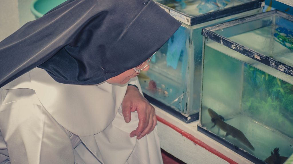 The Sisters of Immaculate Health are expert breeders of the highly endangered Lake Patzcuaro axolotl or ‘achoque’. The nuns rear the creatures in their convent in the Mexican town of Patzcuaro, where they use some of them to make a traditional Mexican remedy for lung conditions. However, collaborating with conservation scientists, their skills at breeding achoques may ensure the survival of the species in its one natural home in Lake Patzcuaro. Victoria Gill tours the convent’s salamander farm and speaks to Sister Ofelia and Sister Sophana, along with biologists Gerado Garcia and Omar Dominguez. (Image: Sister Ofelia and two of the convent’s four hundred achoques, Credit: Will Condliffe, Chester Zoo.)