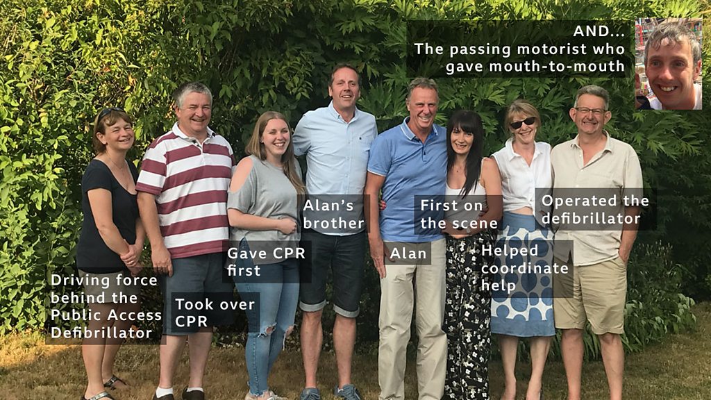 Alan Thompson's life was saved by the combined effort of the residents of the village of Smisby in Derbyshire after he suffered a cardiac arrest whilst on a bike ride. Owners of the local nursery, an ex-firefighter and a passing motorist took turns to give CPR, and a defibrillator was used by a local pilot to bring Alan back to life. Alan told 5 Live Breakfast: "They all came together... [it was] that promptness of action and availability of the defibrillator absolutely saved my life." This clip is from 5 Live Breakfast on Wednesday 8 July 2018.