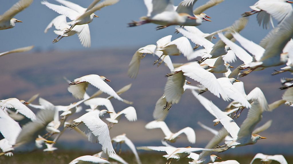 It's an autumnal dawn at the UNESCO World Heritage site of Lake Ichkeul in Tunisia. The freshwater lake is the last remaining in a chain that once extended across North Africa, and along with its surrounding wetland, it's a major stopover for hundreds of thousands of migrating birds. Hugh Miles made this BBC recording at the Sedjnana Delta, with its resident wildfowl of widgeon, mallard, Cetti's warbler and greylag goose. There's a mass take-off from the reeds, and you might even hear eagles call. This image of Bubulcus ibis in flight was taken at Lake Ichkeul by Elgollimoh.