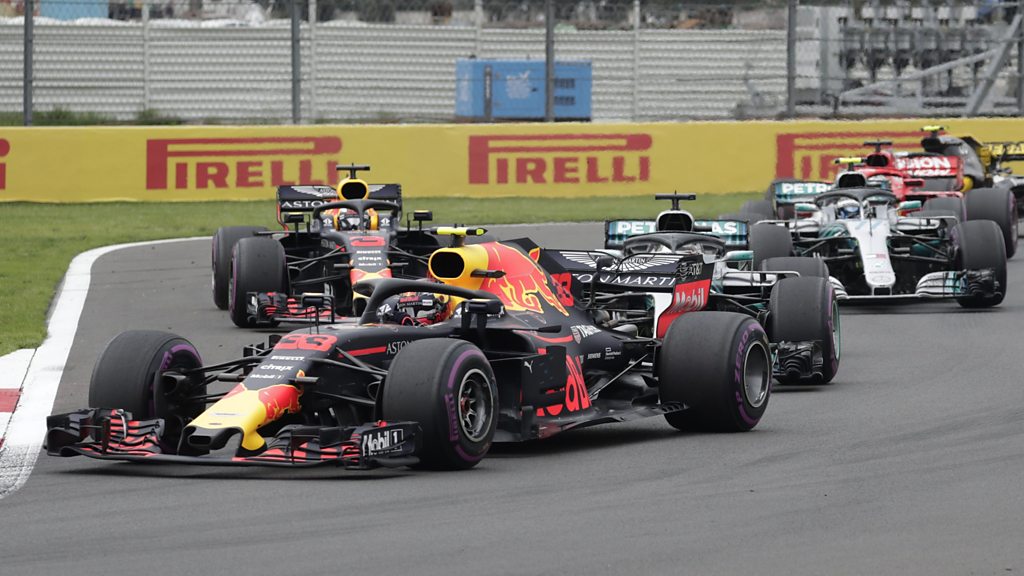 Red Bull's Max Verstappen takes advantage if his teammate Daniel Ricciardo's poor start to take the lead of the Mexican Grand Prix. Lewis Hamilton also overtakes the Australian to move into second place. This clip is originally from 5 live Formula 1 on Sunday 28th October 2018