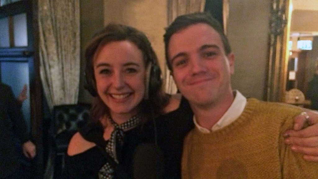 Daf Davies o Boy Azooga yn dathlu ar ôl ennill y Wobr Gerddoriaeth Gymreig