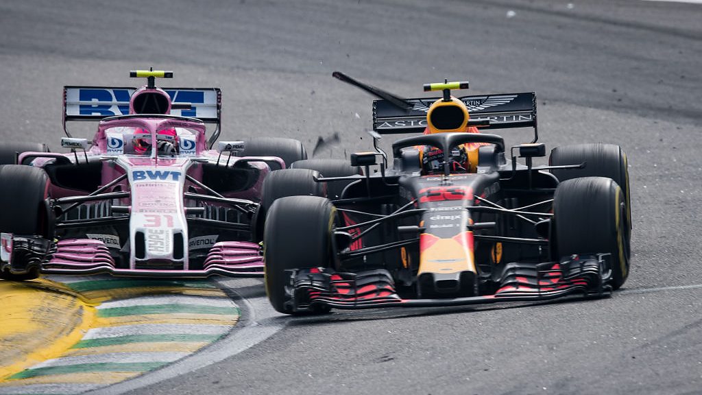 Red Bull's Max Verstappen spins out of the race lead after Esteban Ocon crashes into him whilst trying to unlap himself on lap 43. This clip is from 5 live Formula 1 on Sunday 11th November 2018.