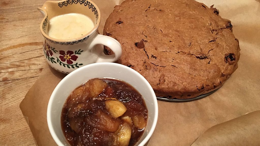 World War 1 Trench Cake with spiced apple and treacle, meadowsweet custard
