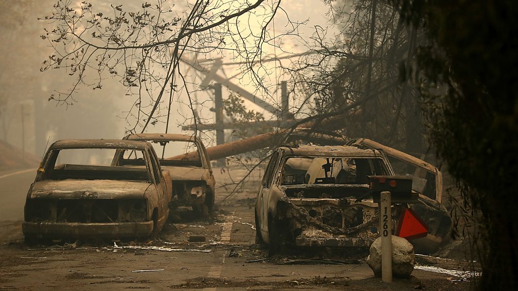 Most of the town of Paradise, California, in the Sierra Nevada foothills, has been obliterated by raging wildfires. Ellen VandenBerg considers herself lucky to be alive. (Power lines rest on cars that were burned by the Camp Fire in Paradise, California. Credit: Justin Sullivan/Getty Images)