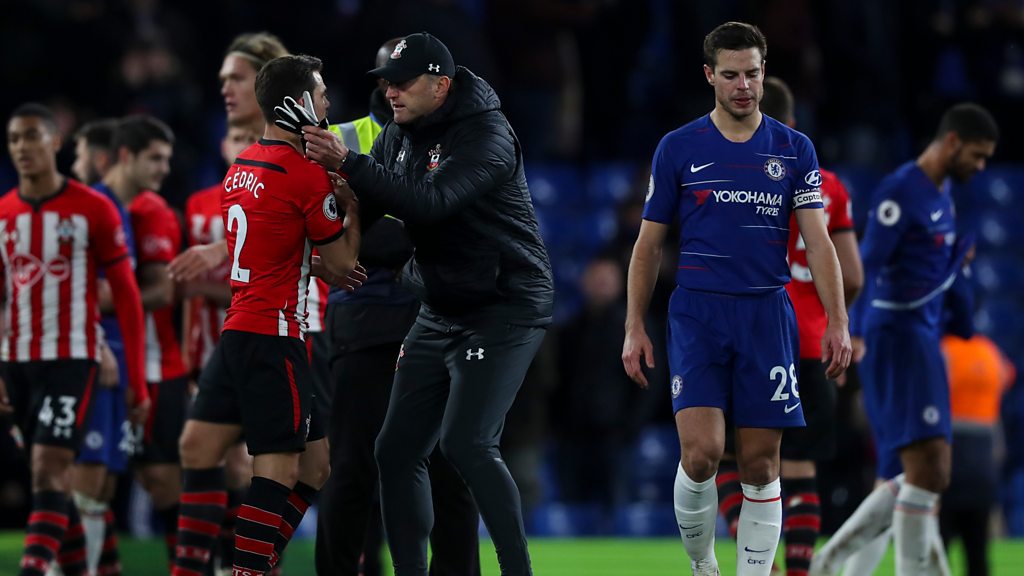 Saints boss Ralph Hasenhüttl speaks to Jordan Clark after the goalless draw.