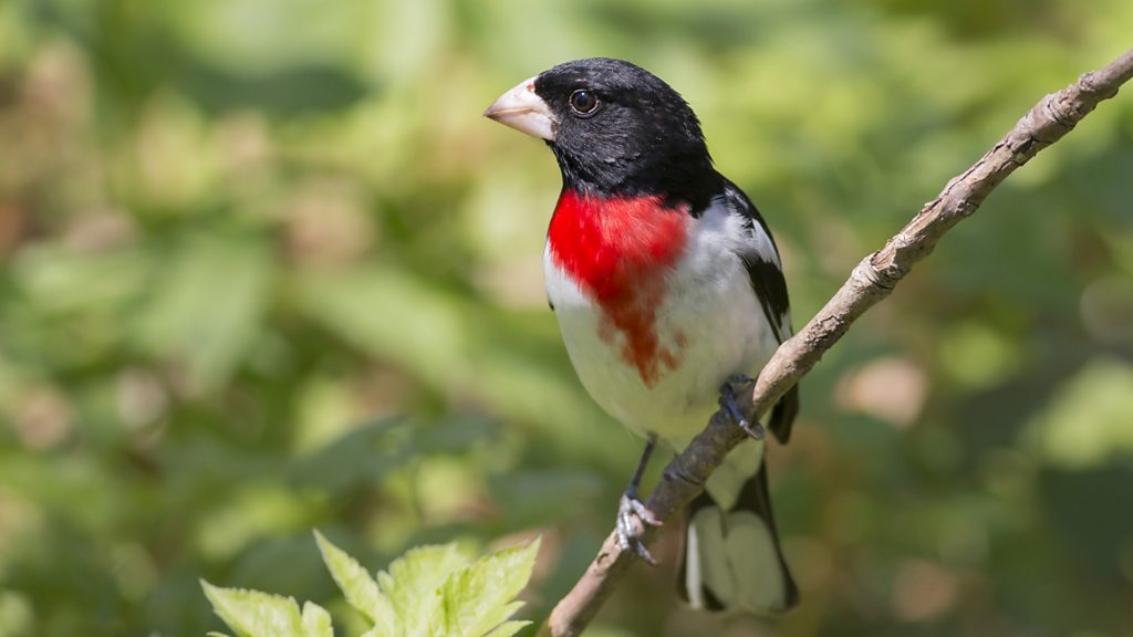 Male rose-breasted grosbeaks have a sweet, rambling song, and their sharp “chink” calls are also distinctive. In this recording you can hear flock cries from these foliage-gleaning birds, a mass take-off and the call of the steller's jay. It was recorded by Bruce Reitherman, high in the Ponderosa pine forest of Denver, Colorado, USA.