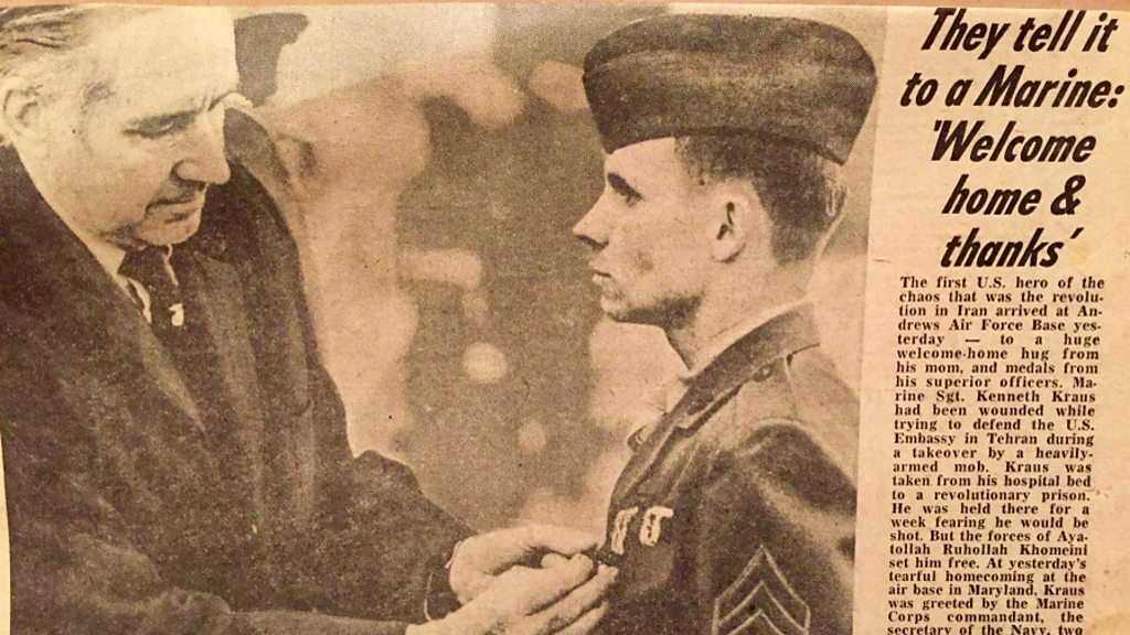Many Americans remember the Iranian Revolution in 1979 for the storming of the US embassy and the hostage crisis that followed. That, however, was not the first time the embassy in Tehran was breached by protesters. The first time was on Valentine's Day in 1979. US Marine and embassy guard Ken Kraus was there. (A newspaper clipping kept by retired Sgt. Ken Kraus. The caption reads: "Navy Secretary Graham Claytor pins Navy Commendation Medal on Kraus in his appreciation for his valor defending US embassy." Credit: Ken Kraus)