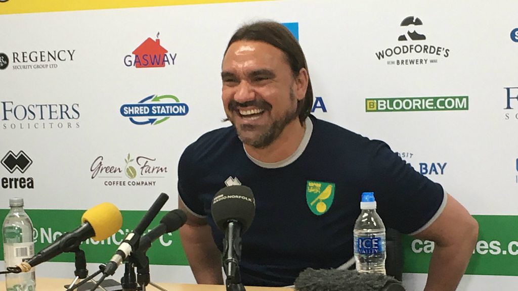Norwich City head coach Daniel Farke speaks to Chris Goreham following the 2-2 draw in their first pre-season friendly.