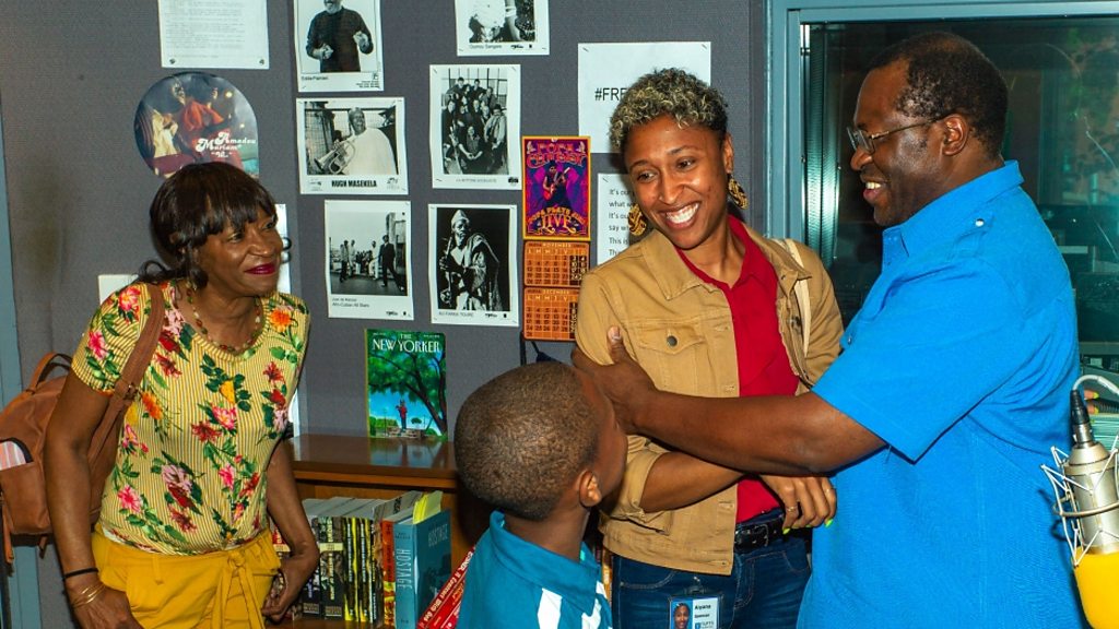 Jean Kapenda is originally from the Democratic Republic of Congo and he had always hoped to help African Americans find their African roots. That dream came true in a very personal way when he met Aiyana Lakes her son, Terrian, and her mother, Audray Spencer. A few years ago, Kapenda did an online DNA test and after getting the results, he was able to trace hundreds of relatives in the Americas. Now Kapenda has been able to tell Lakes and her family about where their African ancestry. (Jean Kapenda and Aiyana Lakes embrace while Lakes' son, Terrian, and her mother, Audray Spencer, look on. Credit: Marco Werman/The World)