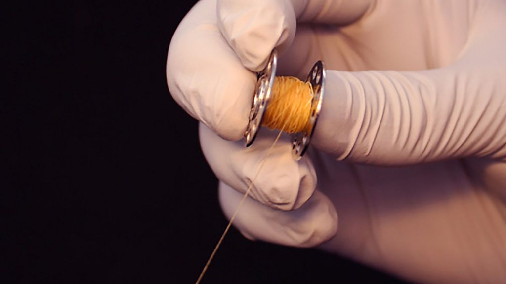 A technique being developed in France has enabled thread to be created from human cells. The biological material is knitted using methods developed in the textile industry, and could be used to repair wounds and mend arteries. Dr Nicholas L'Heureux from the University of Bordeaux is leading the research. He says the technique has enormous potential for other uses in future. (Photo: Thread made from human cells. Credit: Nicholas L'Heureux / University of Bordeaux)