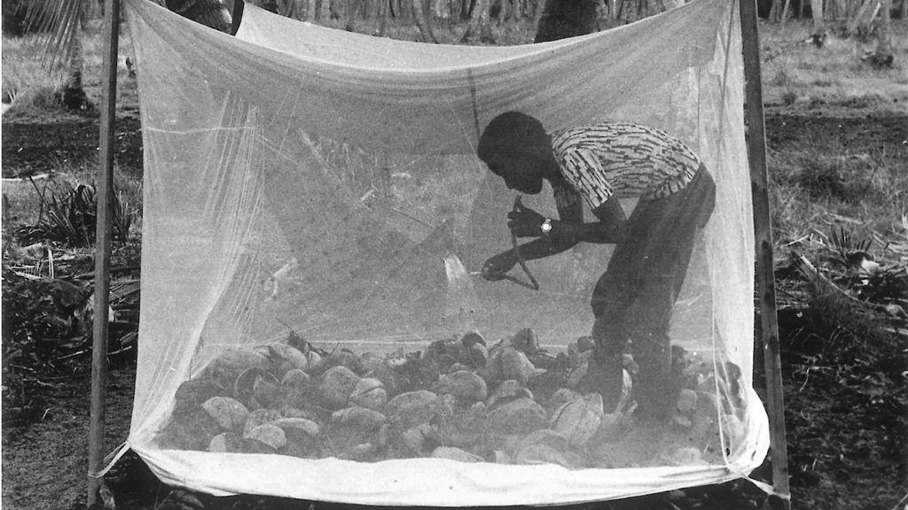 Professor Clifford Mutero works with the Malaria Programme at the International Centre for Insect Physiology and Ecology (ICIPE) in Nairobi, Kenya. He is also the author of 'Mosquito Hunter: Chronicles of an African Insect Scientist'. As a student in the 1980s, he researched mosquito populations on the coast of Kenya south of Mombasa, and he told Bridget Kendall the lengths scientists went to at that time in order to observe the insect's behaviour. Image: Clifford Mutero as a student in the 1980s, in a netted cage full of mosquitoes Credit: From Chronicles of an African Insect Scientist, courtesy of Clifford Mutero