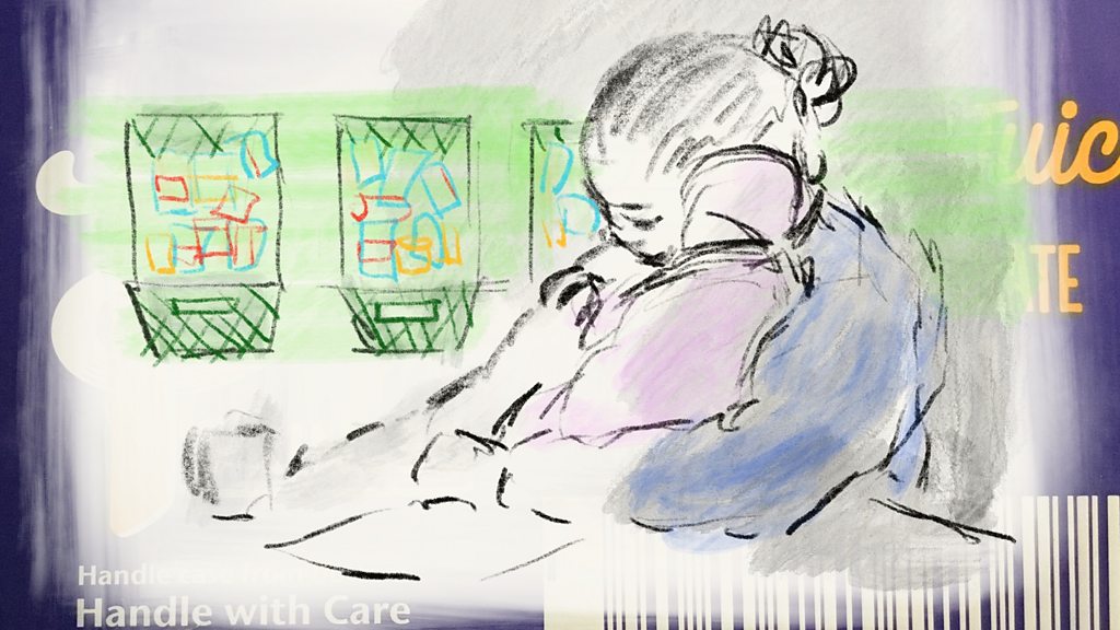 Life inside a Food bank. The use of food banks is up by a fifth since last year according to figures from The Trussell Trust. PM’s Chris Vallance has spent the last few weeks visiting a food bank in Oxford. Here he introduces us to the people who volunteer there, and those who turn to there for help when they run out of money. (Photo: Illustration of Mother and child at Foodbank Credit: Chris Vallance)