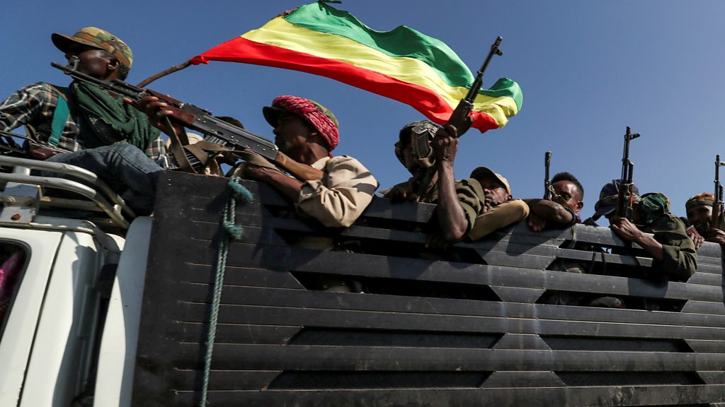 The Ethiopian government launched a military offensive against the TPLF in Tigray on 4 November. There have been reports of continued fighting and attacks across Tigray, and almost 50,000 refugees have fled across the border to Sudan. The increasing numbers of refugees, the failure of supplies being able to arrive in the area and one of the worst locust plagues for years are having serious consequences. The United Nations says the situation is developing into a “full scale humanitarian crisis”. There are also concerns on the impact of the conflict on neighbouring countries. Ethiopia plays a significant role in the Horn of Africa in terms of peace and security and is one of largest contributors to UN peace keeping forces. There are reports it has already withdrawn some of its forces and a fear that as the situation becomes more volatile, countries like Somalia will be affected. Ahmed Soliman, a research fellow with the Africa Programme at Chatham House, explains the devastating impact the situation is already having on the area and the danger that the conflict could affect neighbouring countries and stability in the area. Photo: Members of Amhara region militias head to face the TPLF near a border with Tigray, Ethiopia, November 2020 Credit: Reuters