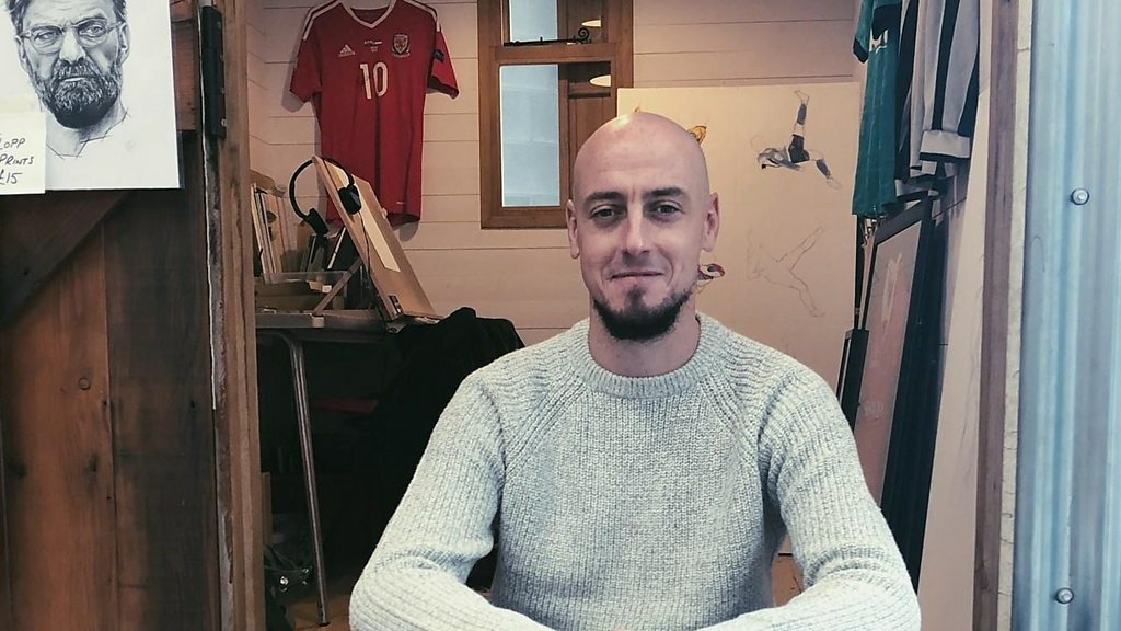 Mae Liam Stokes-Massey o Wrecsam yn arbenigo mewn darluniau pêl-droedwyr Cymru.