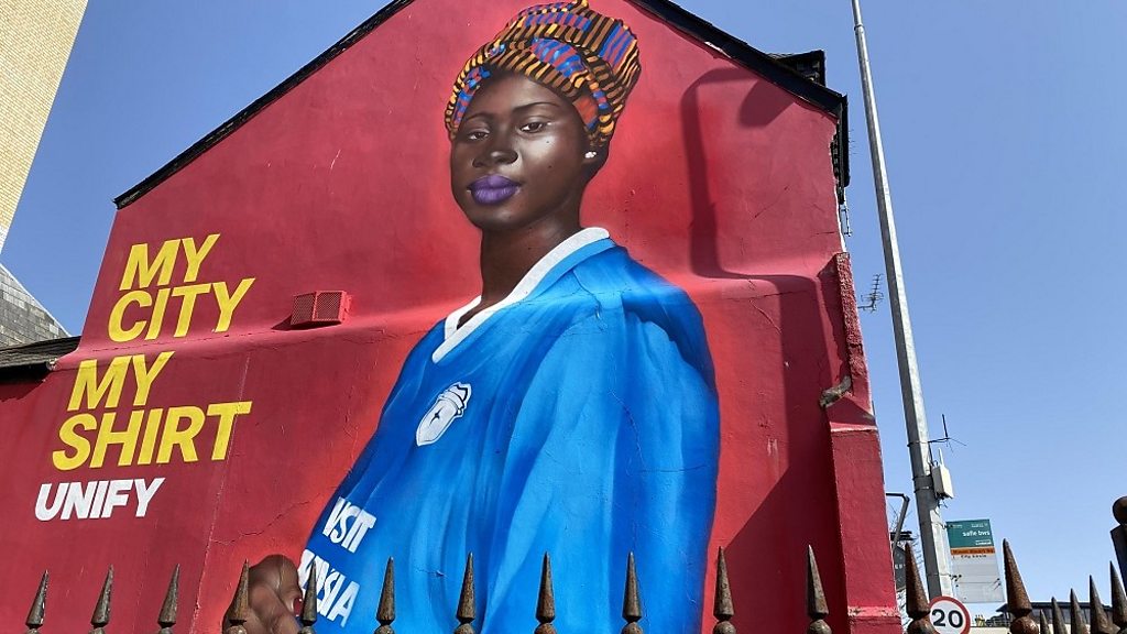 Yr artist Caleb Young a'r murluniau sy'n dathlu pêl-droed