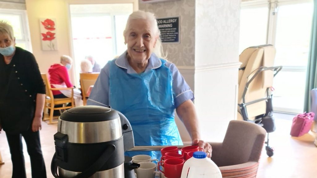 Maureen Townend lives at the Flower Park Care Home in Doncaster but loves helping the other residents. So she is now a volunteer carer and has a uniform and her own trolley.