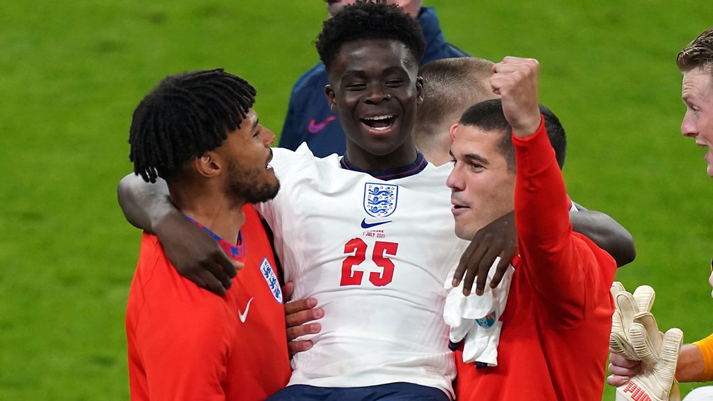 Former England international Tony Dorigo and Premier League-winning manager Claudio Ranieri talk to the BBC World Service's World Football show about England's chances, ahead of their Euro 2020 final with Italy. Gareth Southgate's side have been hailed for their spirit and skill en route to the big game, but will that be enough for them to lift the trophy? Image: Tyrone Mings and Conor Coady lift up Bukayo Saka following England's 2-1 win over Denmark at Euro 2020 (Credit: Mike Egerton/PA Wire)