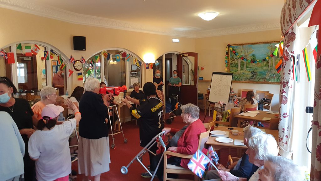 Anna Foster talks to Elaine from Eothen care home in Whitley Bay about their alternative Olympics event including paper aeroplane javelin and paper plate discus.
