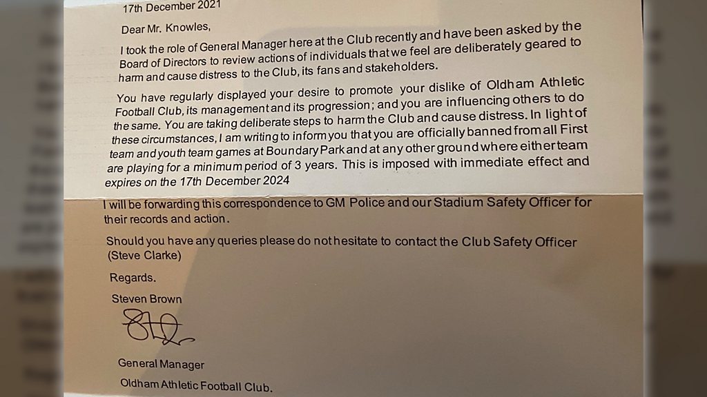 Bradley Knowles, an Oldham Athletic fan, claims he's received a letter from the club banning him from attending games for protesting against the club's owner Abdallah Lemsagam.