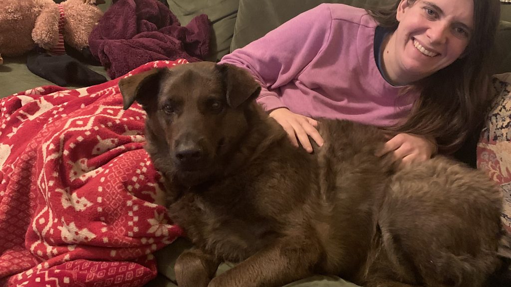 Ariel Jackson o Galiffornia a'i chi Puck sydd wedi bod yn dysgu Cymraeg yn ystod y pandemig