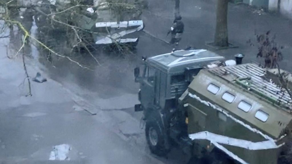 Kherson, a key port city in southern Ukraine was the first major city to be taken by Russia, since Ukraine was invaded. Its mayor, Igor Kolykhaev, said Russian troops had forced their way into the city council building and imposed a curfew on residents. Anna is in an underground shelter with her family and seven-year-old daughter. She says there are other children there, some of whom are suffering from the cold, and even newborns, and the situation is "tough and stressful". She goes on to say that Russian soldiers are walking around the streets, and have occupied different sites with vehicles and tanks. She says people are scared to go on to the street, and the shelter is relying on charitable donations for food. Photo: A military truck and tank are seen on a street of Kherson Credit: Reuters