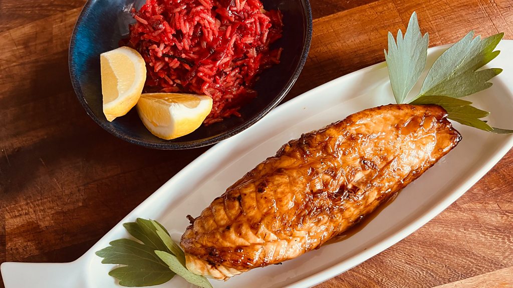 Whiskey Glazed, Tea Smoked Monkfish with Spiced Beetroot Pilau