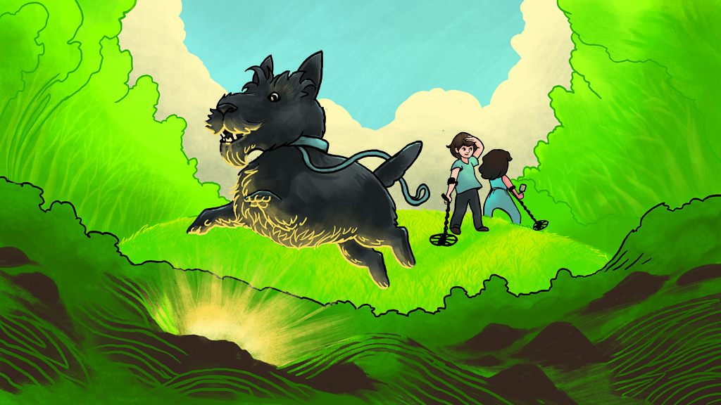 Harris and Iona decide to have a treasure-hunting competition. They reluctantly bring their dog Growler along with them, and the expedition takes an unexpected turn.