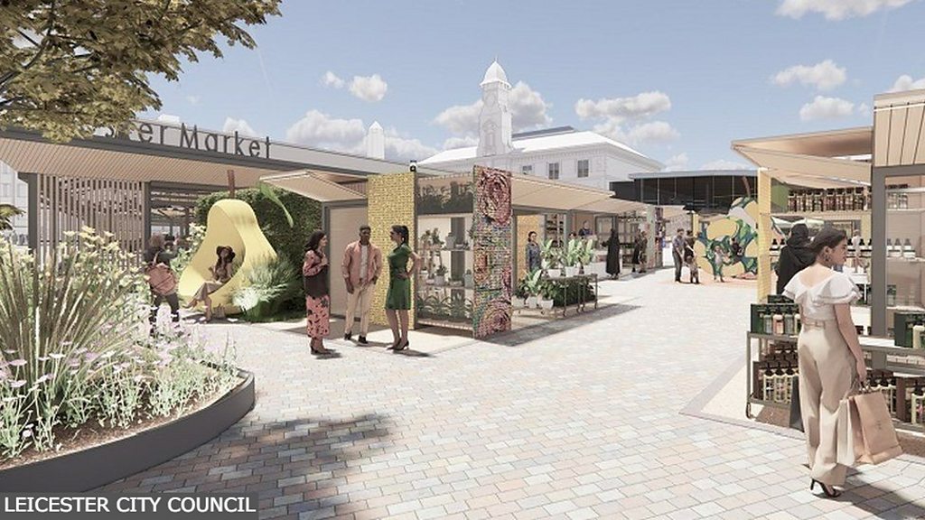 Plans for a £7.5m revamp of Leicester's outdoor market in the city's Old Town have been revealed. Mayor Sir Peter Soulsby outlined the designs which would include upgrades for stalls, enhanced lighting, paving, and a shuttered perimeter to keep the site secure at night. Subject to planning permission, work on the market refurbishment could get under way in spring 2023 and will take about 15 months to complete. Helen McCarthy went to the plan's unveiling.