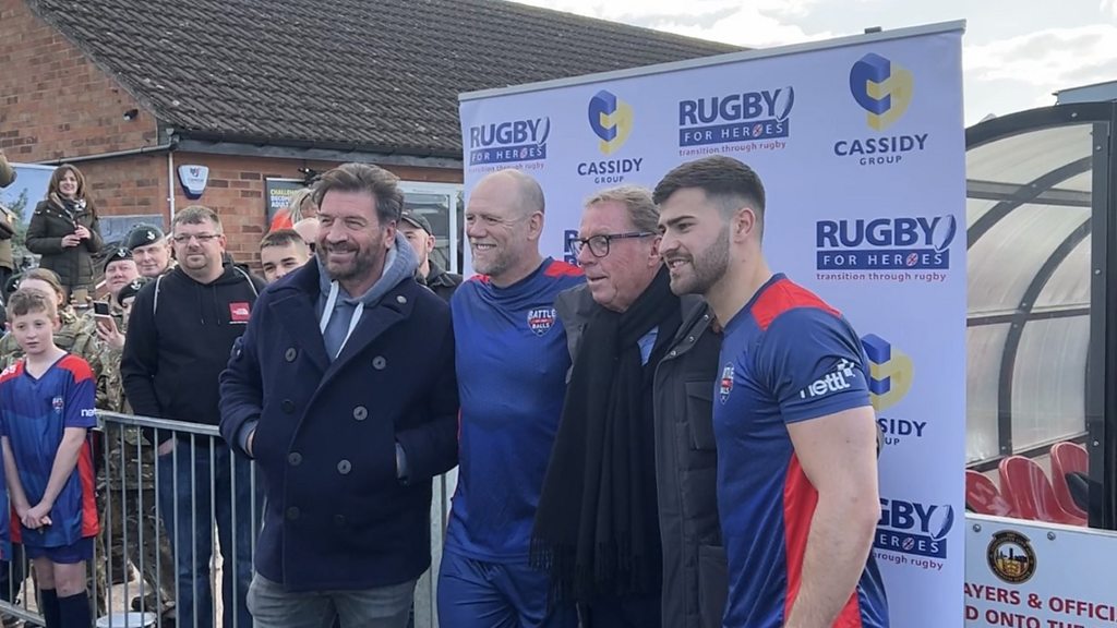 A host of rugby stars swapped sports for a charity football match at Gloucester City's Meadow Park. Led by former Gloucester and England legend Mike Tindall alongside Hollyoaks & I'm a Celebrity star Owen Warner, they took to the football pitch in a team managed by Harry Redknapp. The game against a group of former footballers from Gloucester City FC was to raise money for the charity Rugby for Heroes. BBC Radio Gloucestershire's Dan Ayers was at the game.