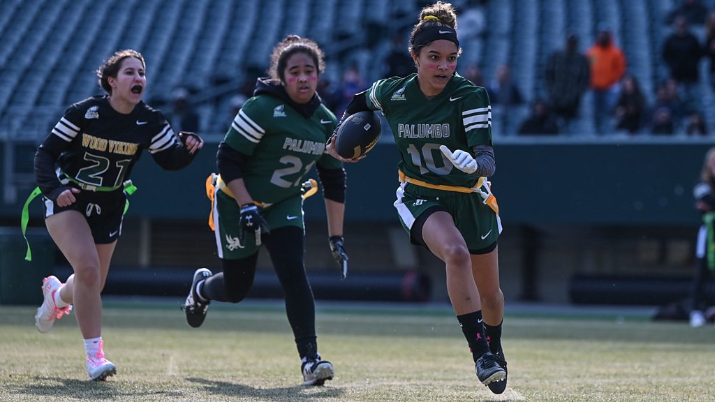 Philadelphia Eagles are helping keep girls involved in sport by investing in Flag Football and the support of over 30,000 sports bras. The league the NFL team set-up in 2022 has now grown to 52 teams with the goal to make girls' flag football an officially sanctioned sport in the state of Pennsylvania. Key to their strategy is making sure girls have the right equipment - including sports bras. They have launched Operation Warm to give out over 30,000 sports bras to athletes in need this year. Palumbo Lady Griffins player Ruth Duink and her coach Chris Donnelly speak to Sportshour about the impact this has had. (Photo: Palumbo Griffins playing at Lincoln Financial Field, the home of the Philadelphia Eagles. Credit: Philadelphia Eagles)